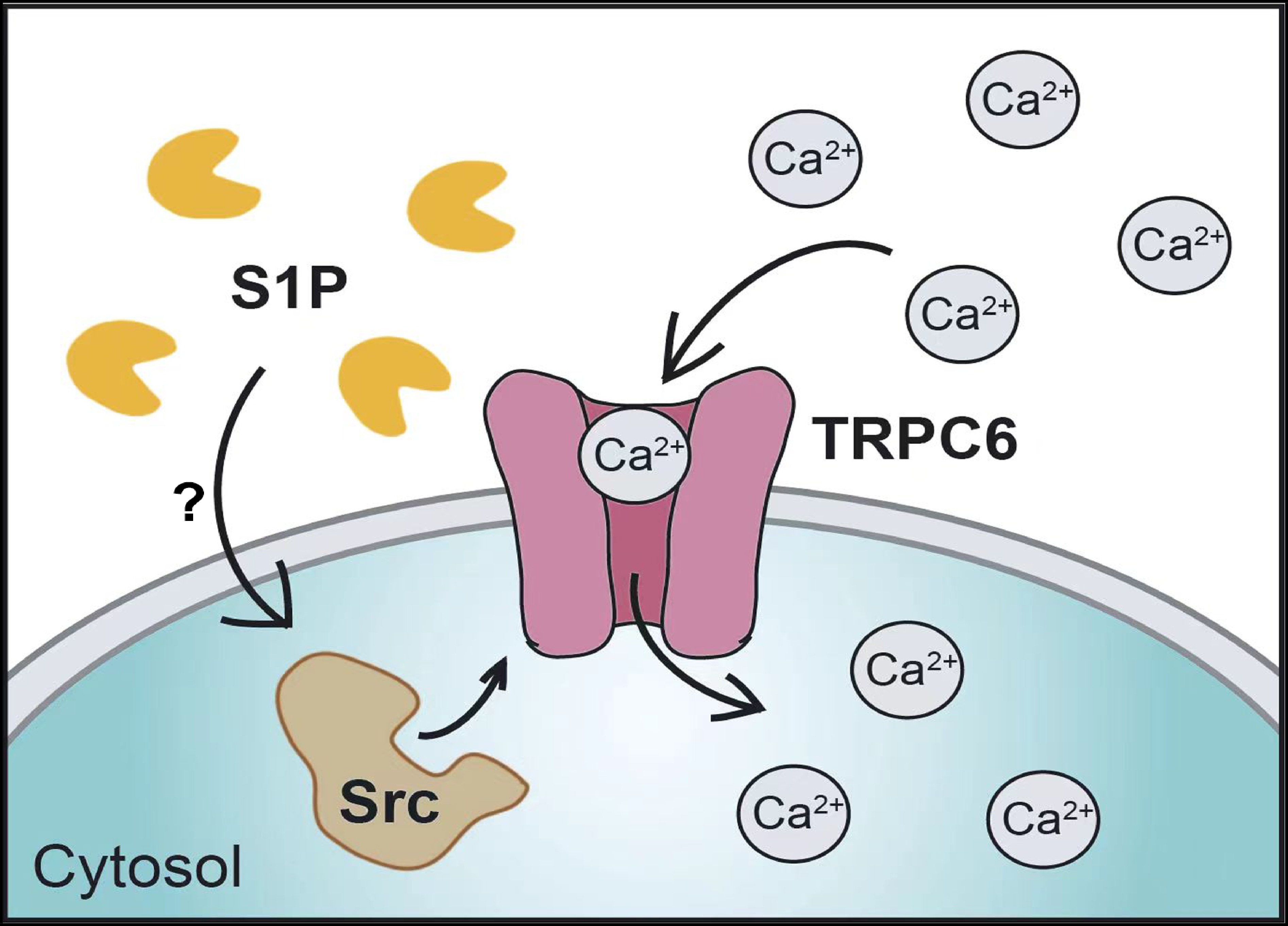 Sphingosine-1-phosphate (S1P) is a widely expressed biologically active sphingolipid that plays an important role in cell differentiation, migration, proliferation, metabolism and apoptosis. S1P activates various signaling pathways, some of which evoke Ca2+ signals in the cytosol. Few studies have focused on the mechanism by which S1P evokes Ca2+ signals in neurons. Here, we show that S1P evokes global Ca2+ signals in SH-SY5Y cells and hippocampal neurons. Removal of extracellular calcium largely abolished the S1P-induced increase in intracellular Ca2+, suggesting that the influx of extracellular Ca2+ is the major contributor to this process. Moreover, we found that S1P-induced Ca2+ mobilization is independent of G protein-coupled S1P receptors. The TRPC6 inhibitor SAR7334 suppressed S1P-induced calcium signals, indicating that the TRPC6 channel acts as the downstream effector of S1P. Using patch-clamp recording, we showed that S1P activates TRPC6 currents. Two Src tyrosine kinase inhibitors, Src-I1 and PP2, dramatically inhibited the activation of TRPC6 by S1P. Taken together, our data suggest that S1P activates TRPC6 channels in a Src-dependent way to induce Ca2+ mobilization in SH-SY5Y cells and hippocampal neurons.