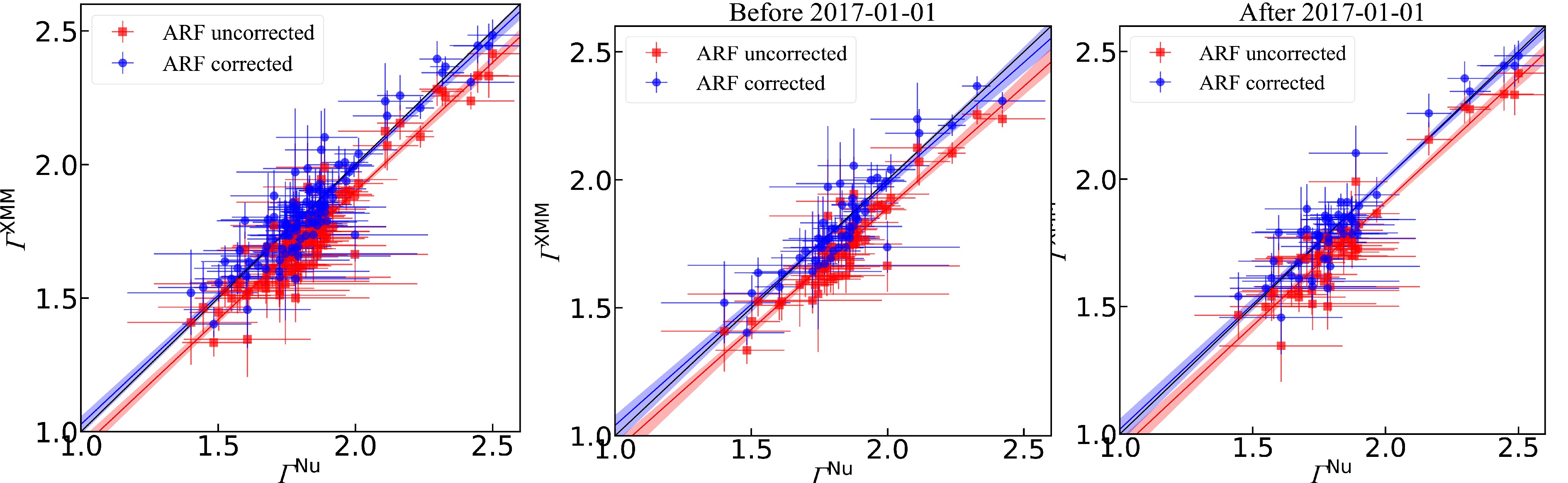 NuSTAR exposures (merging good time intervals (GTIs) from two missions) to avoid bias due to the rapid spectral variability of the AGN. Before the correction, the EPIC-pn spectra are systematically harder than the corresponding