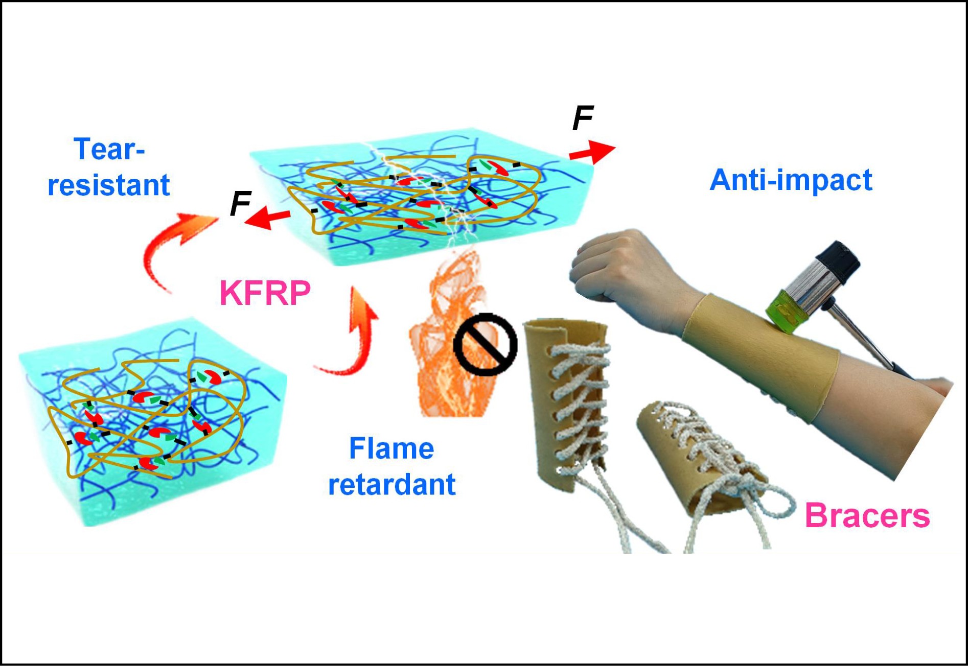 • Personal safety protection has played an important role in daily life. Developing advanced functional safeguarding composites with enhanced anti-impact and excellent thermal properties will be a significant development for body armor. Herein, Kevlar fiber reinforced polymers (KFRP) were fabricated by introducing short Kevlar fibers (KFs) into a shear stiffening elastomer (SSE). The storage modulus of KFRP with 15 wt% KFs (KFRP-15%) increased from 222.8 kPa to 830.8 kPa when the shear frequency varied from 0.1 Hz to 100 Hz. KFRP-15% achieved a higher tensile strength (2.65 MPa) and fracture toughness (11.95 kJ/m2) than SSE in the vertical type, showing superior tear resistance. Additionally, KFRP-15% exhibited promising anti-impact properties, which could dissipate the drop hammer impact force from 1.74 kN to 0.56 kN and remained intact after 10 consecutive impacts. Moreover, KFRP-15% also presented excellent stab-resistant performance. In addition, KFRP-15% also showed improved heat transfer properties, flame retardancy, and smoke suppression capabilities. Finally, functional bracers based on KFRP-15% for protection, thermal-dissipation, and flame-retardant were successfully prepared.